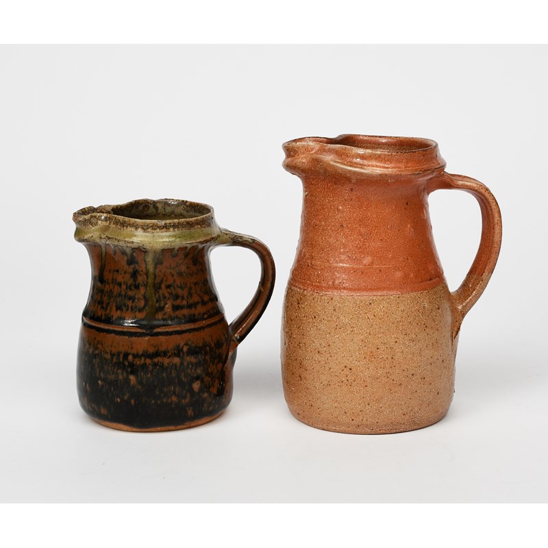 a salt-glazed stoneware jug, and a smaller ash glazed stoneware jug by Richard Batterham,