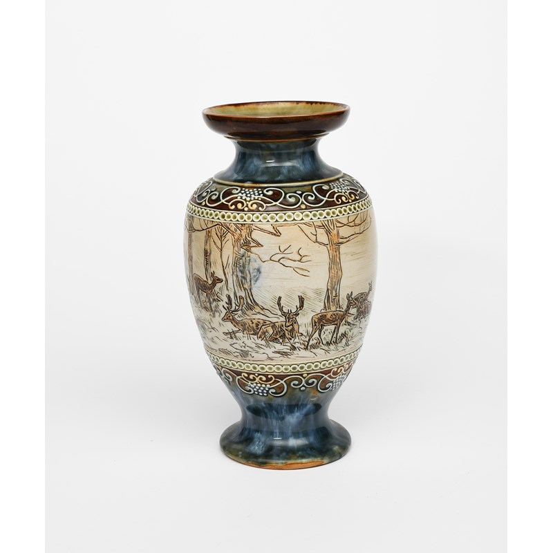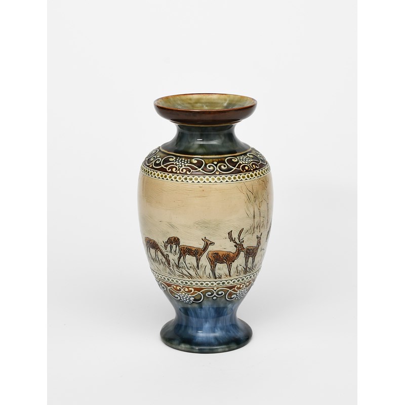 A Doulton Lambeth stoneware vase by Hannah Barlow, baluster form, painted with a herd of deer,