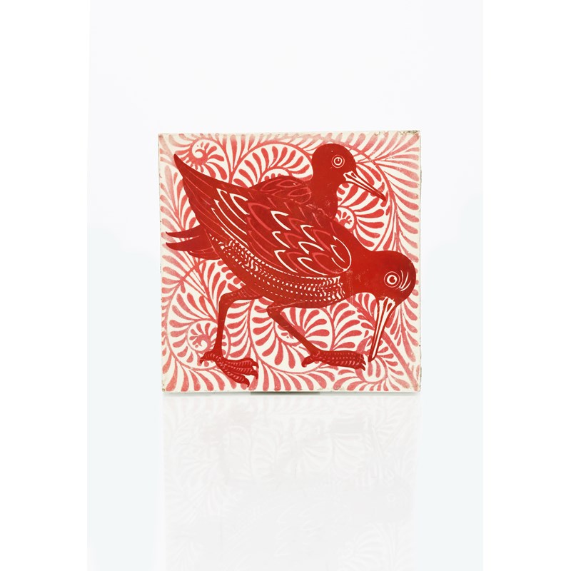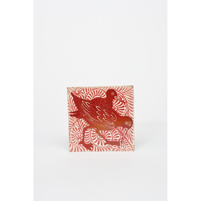 A William De Morgan ruby lustre Waders tile, probably Wedgwood blank, painted with two wading birds, on scroll ground, unsigned, light surface wear,14.8cm. square