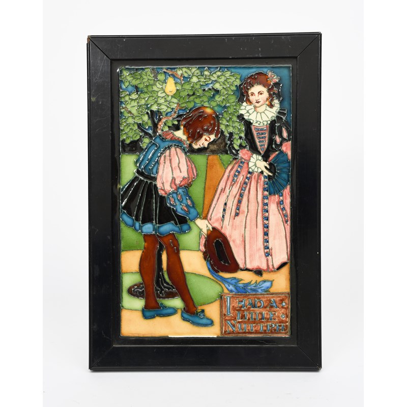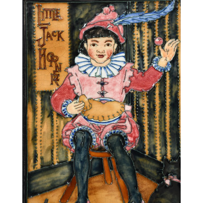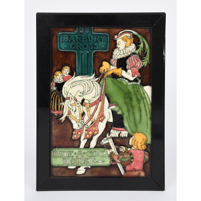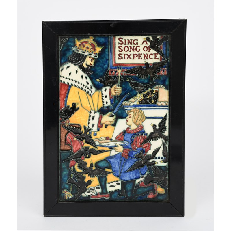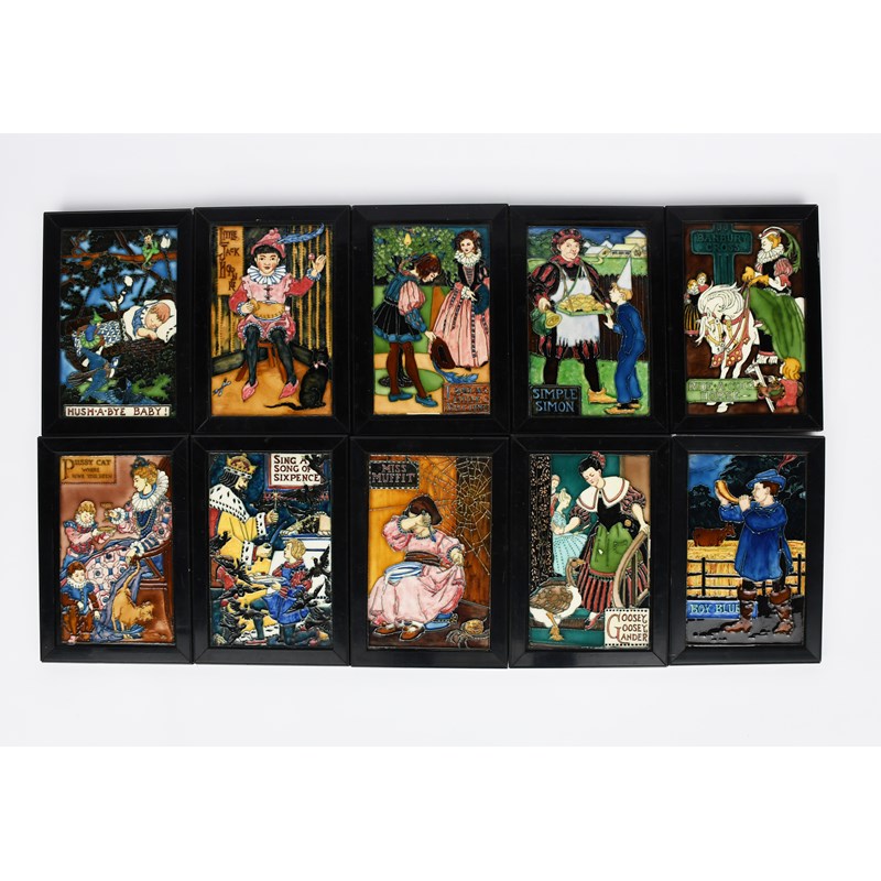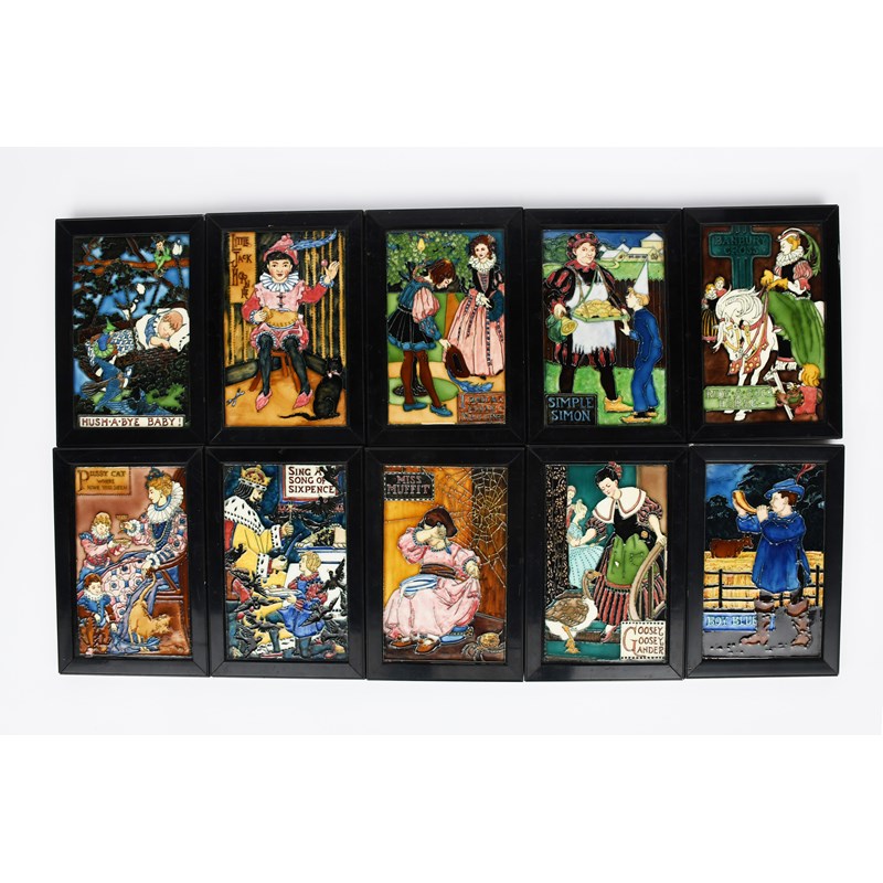 A rare and probably unique set of ten Pilkington's Lancastrian Nursery Rhyme tiles by Margaret Pilkington, designed in 1917, each rectangular and tubeline decorated in colours, in ebonised wood frames, comprising;