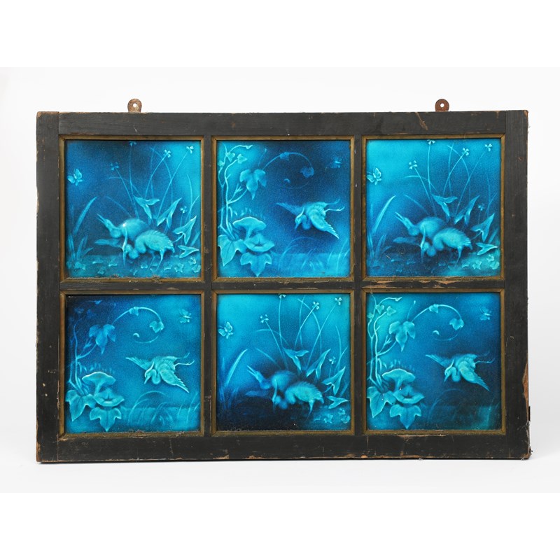 A set of six large dust moulded tiles possibly by Burmantoft's Faience, modelled in low relief with wading birds and butterflies amongst foliage, glazed blue tiles unsigned, 20.5cm. square