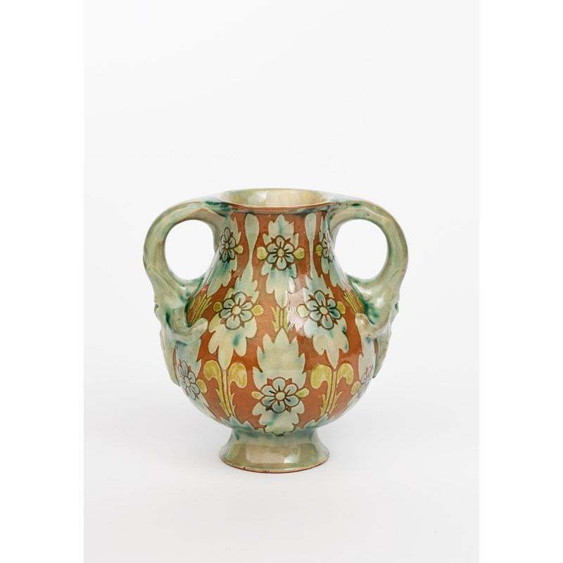 A Della Robbia Pottery twin-handled vase by GEMB, twin-handled form with mask terminals, incised and painted with panels of flowers and foliage, in yellow, green and turquoise on a buff ground, incised marks, painted GEMB monogram, 17cm. high