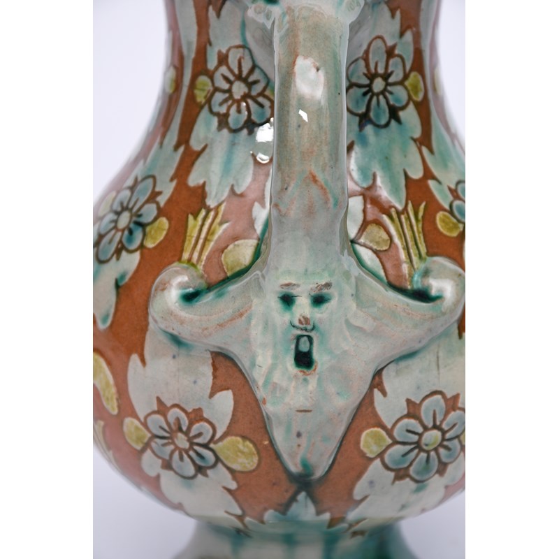 A Della Robbia Pottery twin-handled vase by GEMB, twin-handled form with mask terminals, incised and