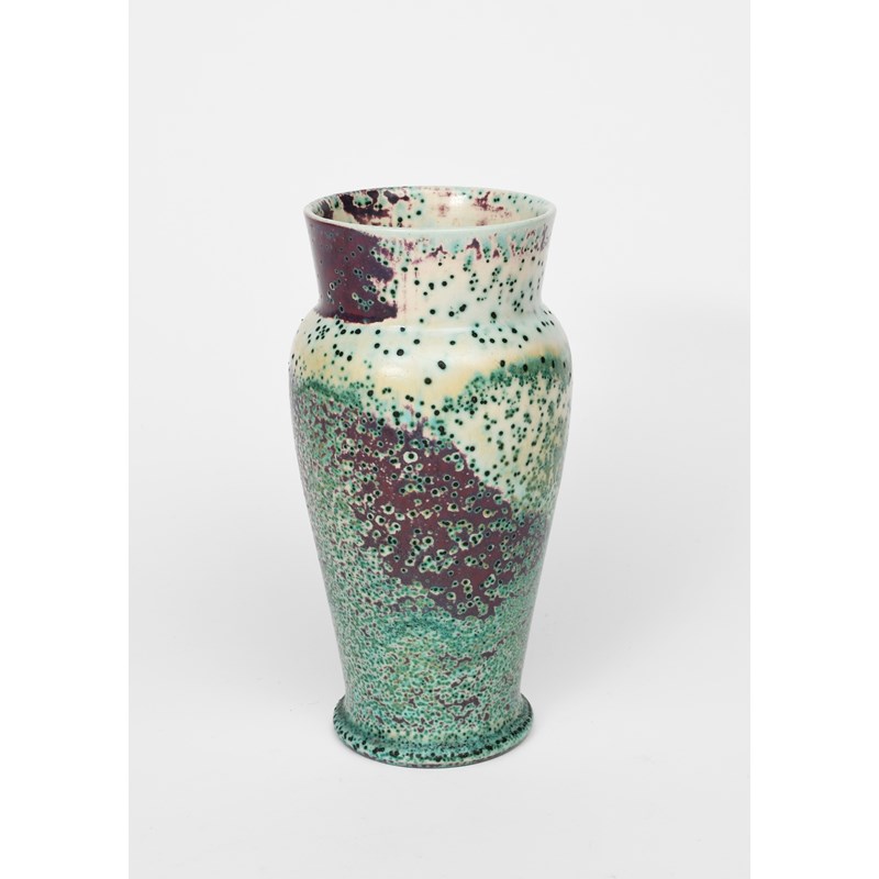 A Ruskin Pottery High-fired stoneware vase by William Howson-Taylor, shouldered, flaring cylindrical form covered in a speckled turquoise glaze over purple, sang de boeuf and white painted scissor mark, impressed monogram, 24.5cm. high