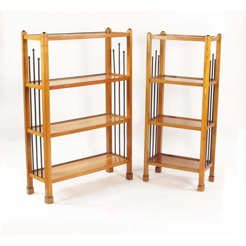 A Biedermeier style fruitwood bookshelf, rectangular with ebonised wood rod decoration, and another smaller, 128cm high, smaller bookshelf 125cm high