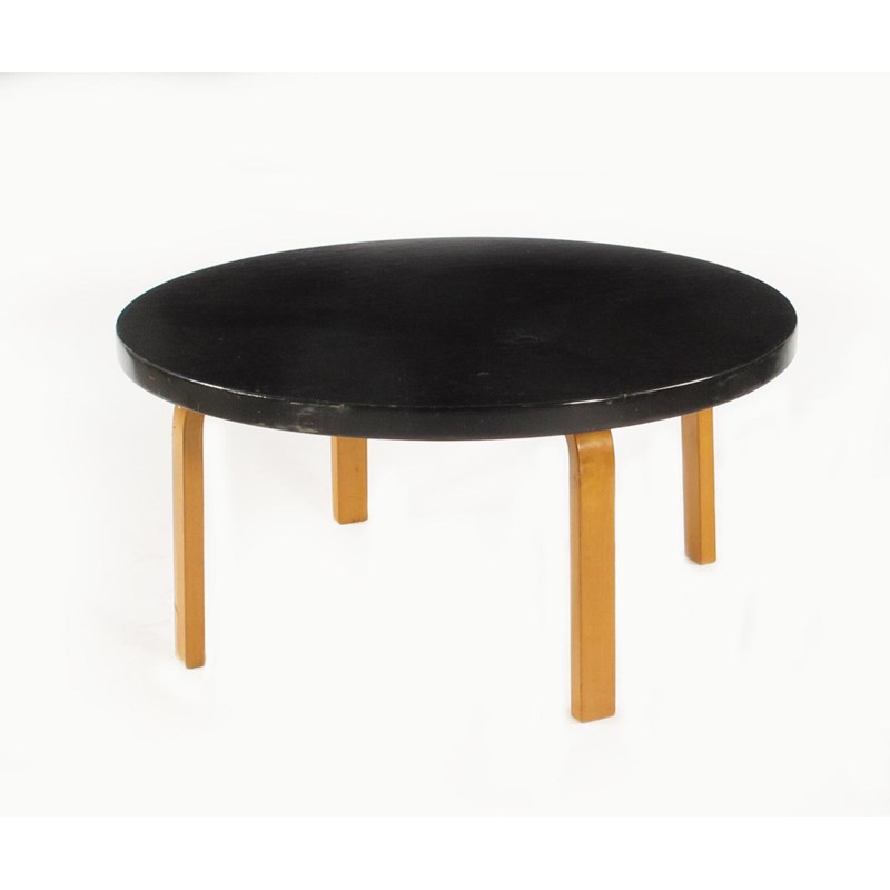 A Finmar beech table designed by Alvar Aalto, the black painted circular top on bentwood legs, applied label 100cm. diam.