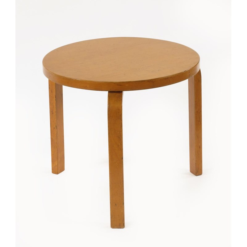 A Finmar walnut occasional table designed by Alvar Aalto, circular top on three bentwood legs applied label 48cm diam, 44cm high