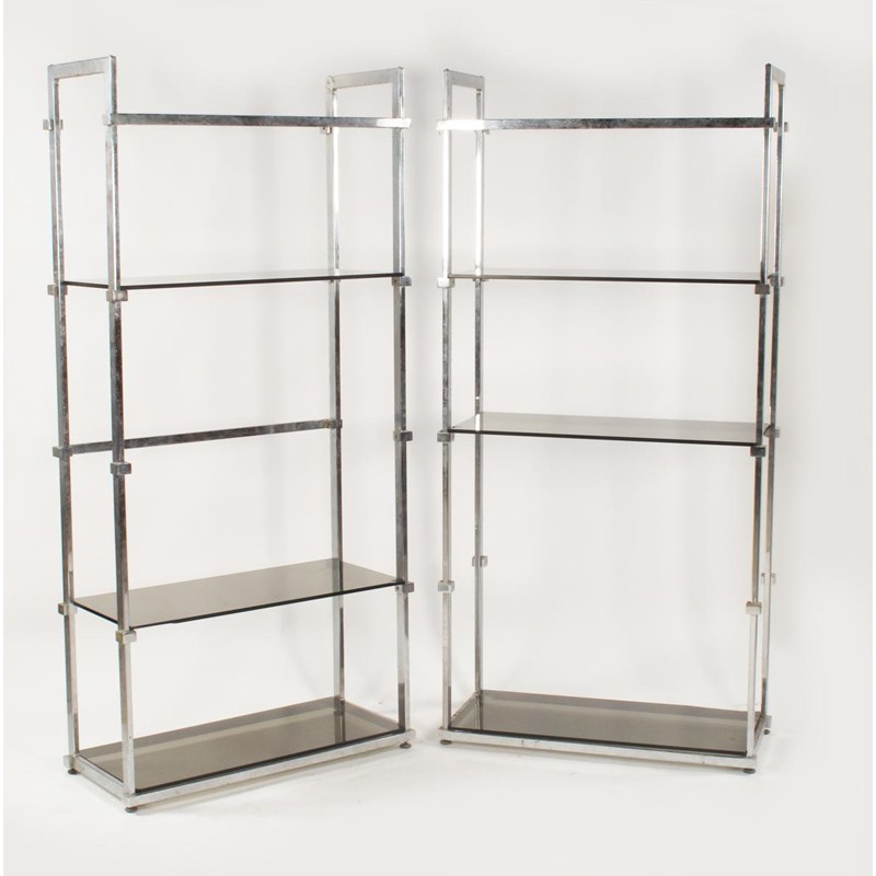 A pair of chrome free-standing shelves with smoked glass shelves, rectangular form with six glass shelves 181cm. high