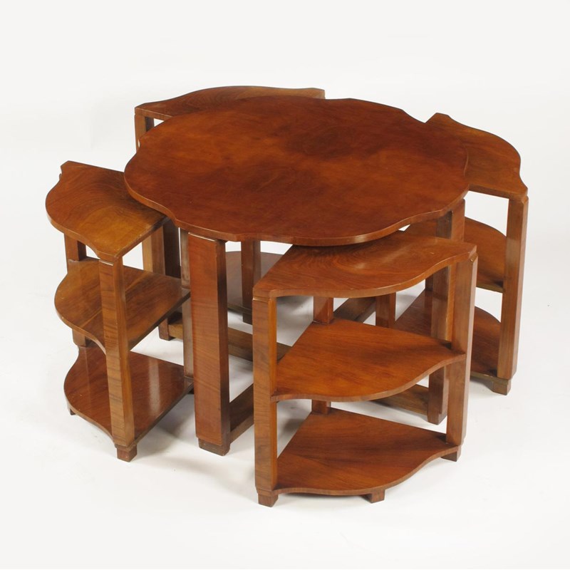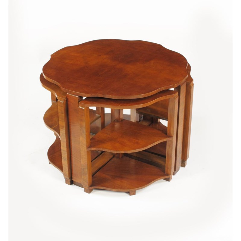A quartered walnut table with four quarter occasional tables, shaped, round top with locking bars, 73cm. diam.