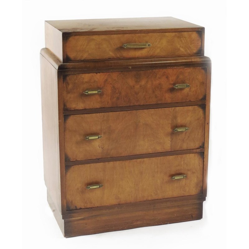 An Art Deco walnut chest of drawers, with stepped top and brass furniture 91cm. high