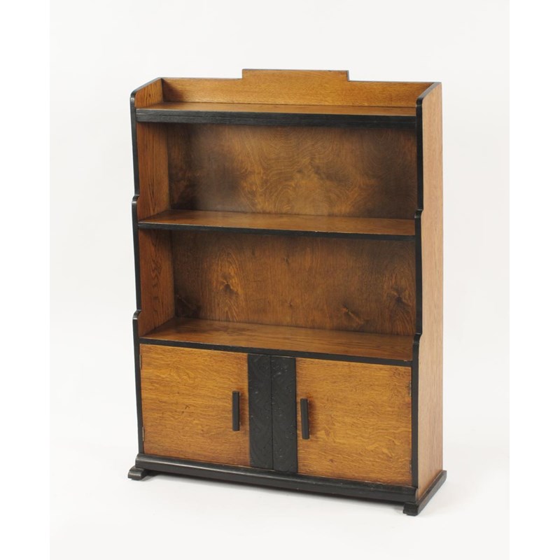 An oak bookcase over cupboard, with painted ebonised detailing the cupboard with carved decorative panels, 105cm high, 76cm. wide