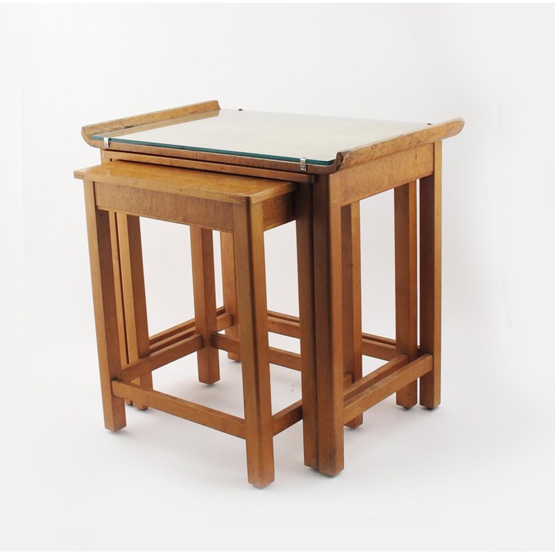 A nest of three satinwood veneer tables designed by Laszlo Hoenig, each rectangular tops, the largest with upturned ends and glass cover 57 x 36cm.