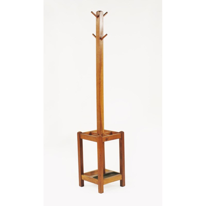 A Heal's oak coat and umbrella hall stand, square section, with one drop in tray, one tray missing 173cm. high