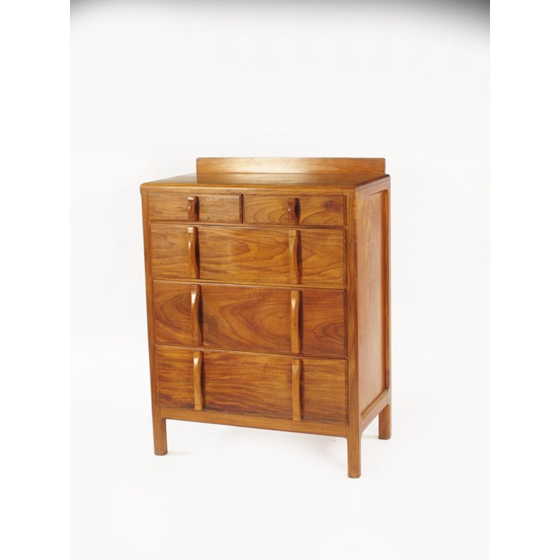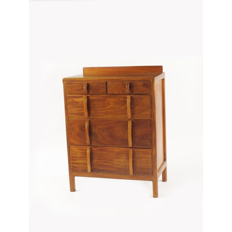 A Cotswold School walnut dressing chest, three drawers under two short drawers with carved wood handles, 113cm high, 84cm