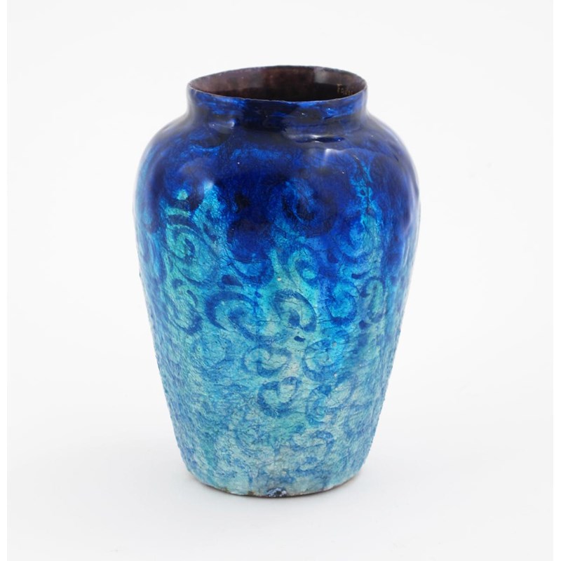 A small Faure enamelled copper vase, shouldered form, enamelled with scroll design on graduated blue ground signed to top rim 10cm. high