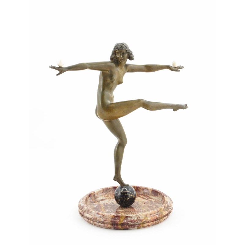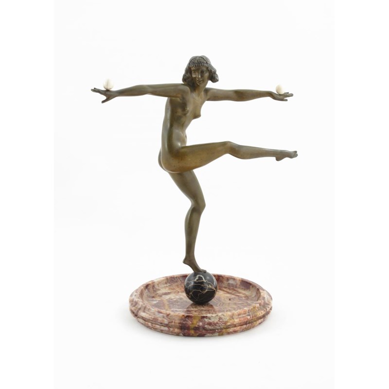 λ A patinated bronze model of a dancer cast from a model by Marcel-Andre Bouraine, modelled her arms outstretched balancing ivory balls on her hands, balancing on black veined marble ball set on red marble tray signed Bouraine to the ball, 42cm. high
