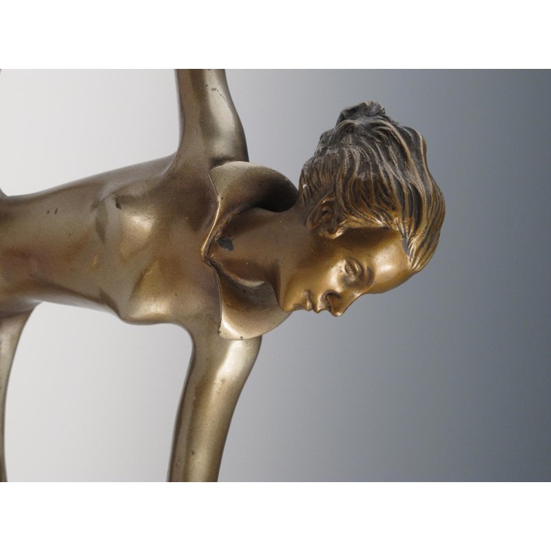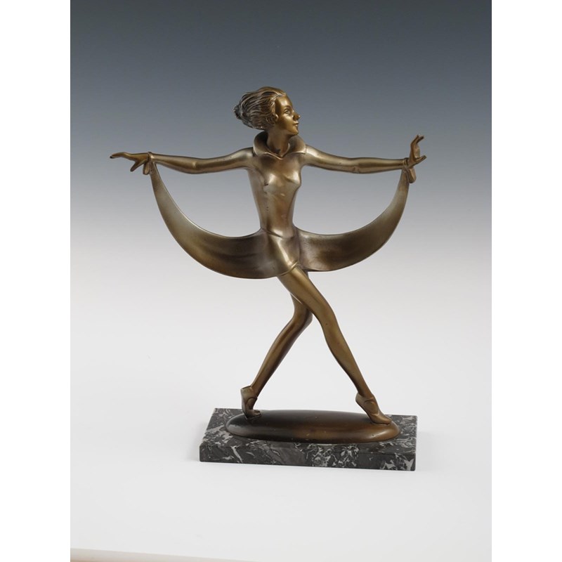 A large patinated metal model of a dancer, in the manner of Josef Lorenzl. modelled with arms raised out and lifting her dress, on rectangular base unsigned 34.5cm. high