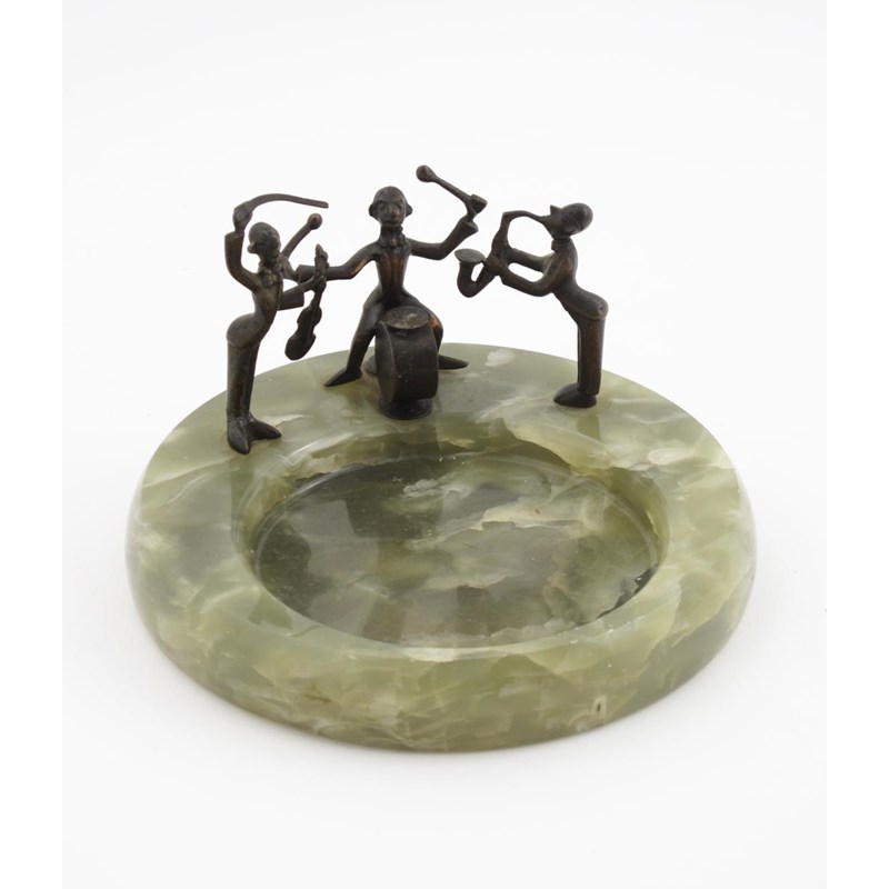 A patinated bronze group of three Jazz musicians, modelled as African American musicians, mounted on green onyx base, unsigned 14.5cm. diam.