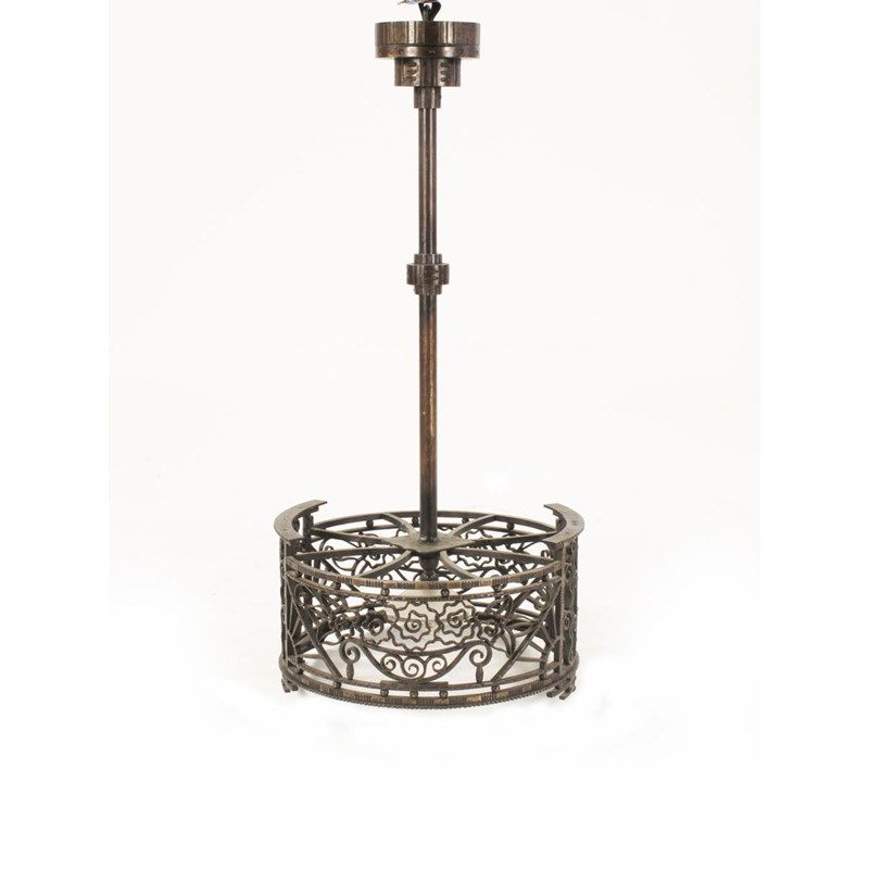 A patinated metal ceiling light, in the manner of Edgar Brandt, circular section, decorated with a pierced frieze of foliage and sunray motif, 97cm. high