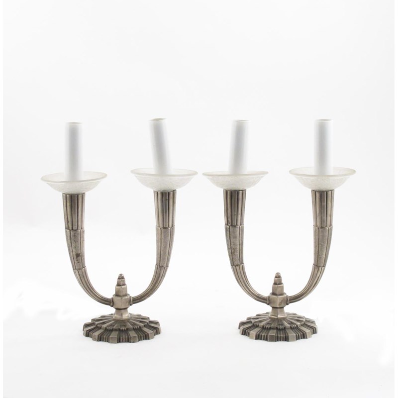 A pair of Etling silvered metal lamps, twin branch form with Muller Luneville frosted glass shades, acid etched marks to shades 33.5cm. high