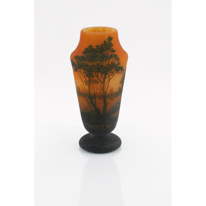 A Daum Nancy cameo glass vase, shouldered form, orange glass, cameo decorated in green with trees on a lakeside setting cameo signature Daum Nancy to foot 23cm. high