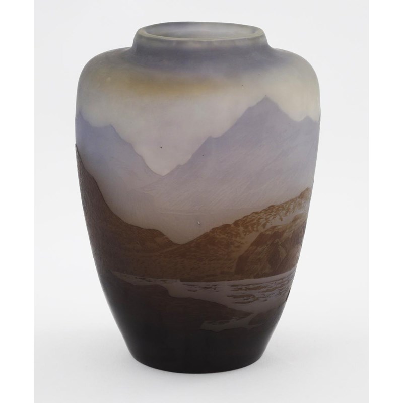 An Art Nouveau Galle cameo glass vase designed by Emile Galle, shouldered form, pale purple overlaid with purple decorated with a mountain lake scene came Galle signature 19cm. high