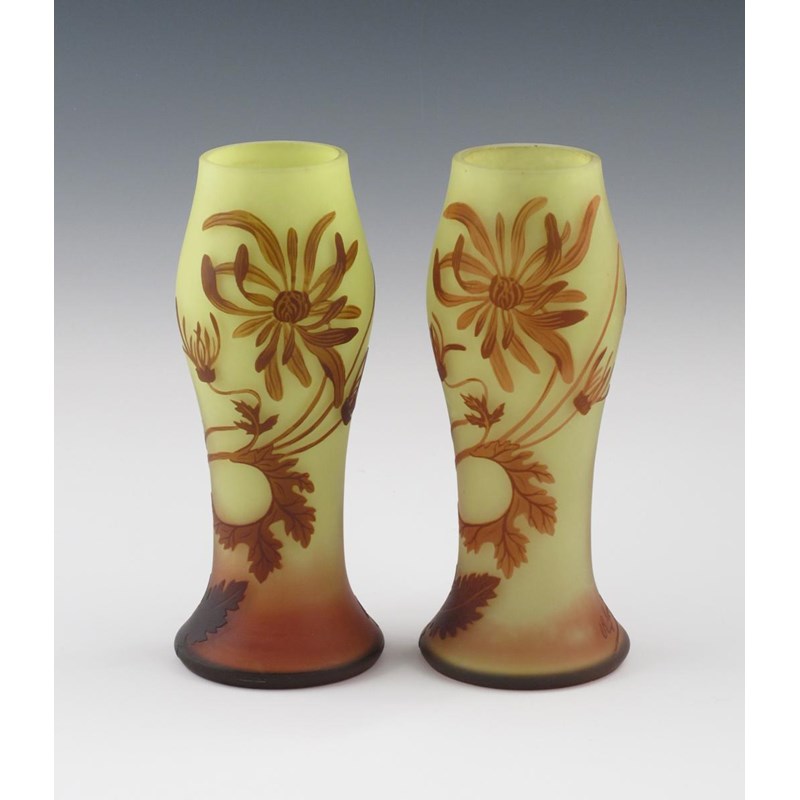 A pair of Richards cameo glass vases made by Loetz, swollen cylindrical form, decorated with honeysuckle in orange on a yellow ground, cameo signature Richards 26cm. high