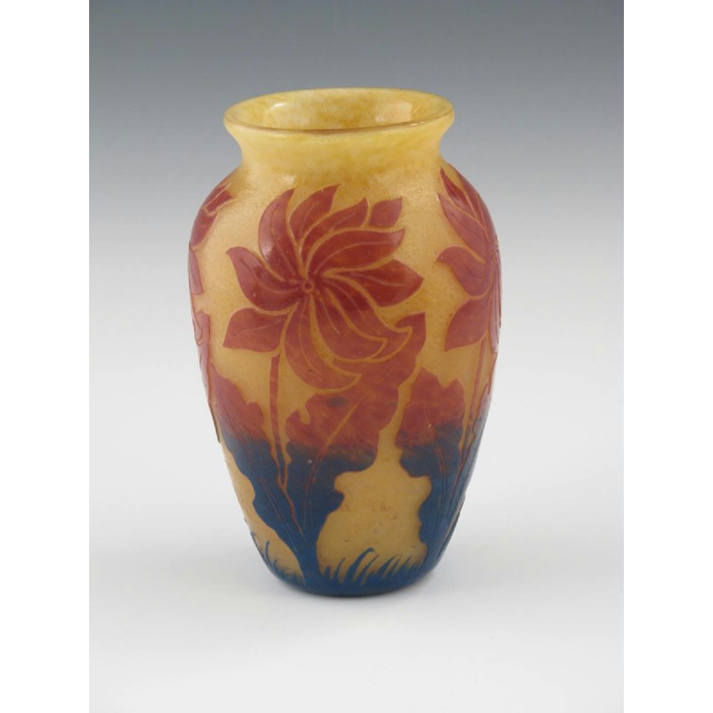 A Degue cameo glass vase, shouldered form with everted rim, mottled orange body cased with red and blue flower stems acid etched cameo mark to body 23cm. high