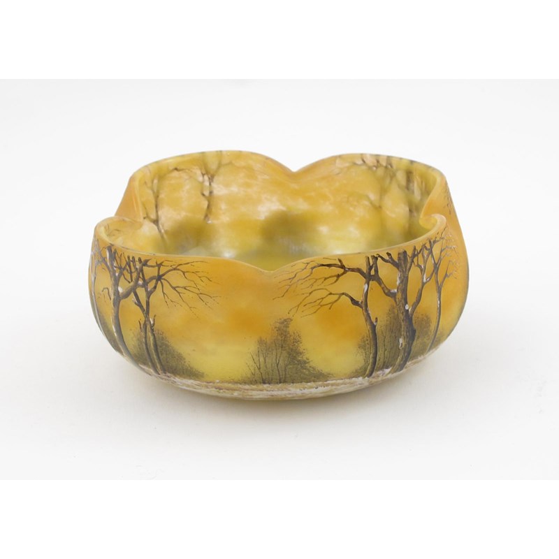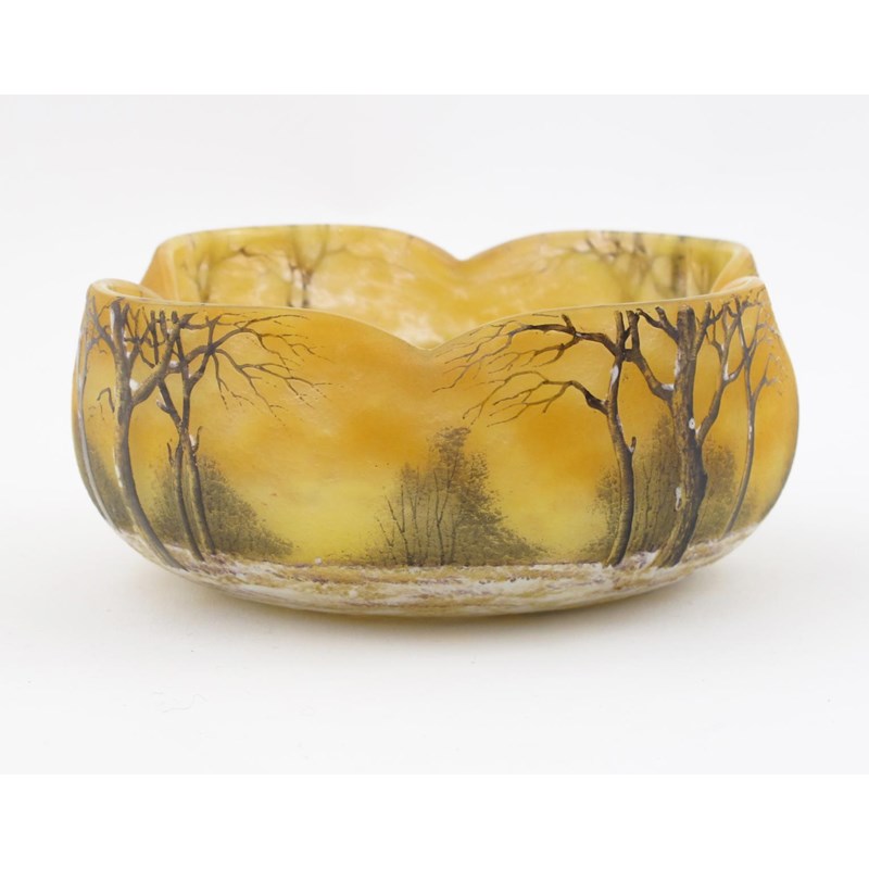A Daum Nancy enamelled glass Winter Landscape bowl, quatrelobed section, acid-etched in low relief and enamelled with trees in a snowy landscape enamelled Daum Nancy mark 15.5cm. wide.