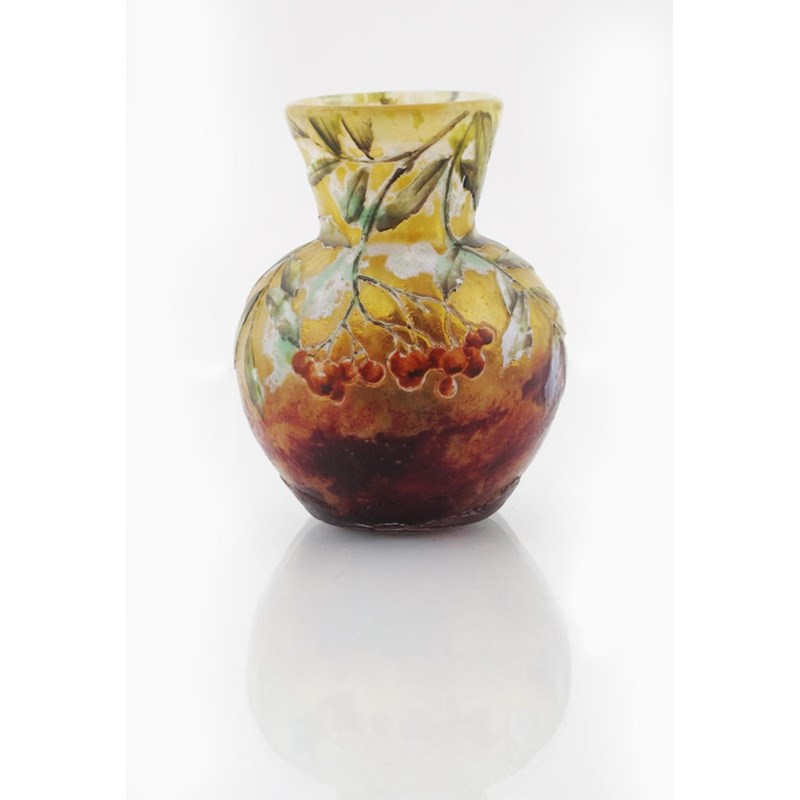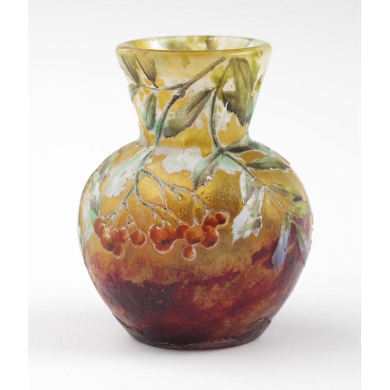 A rare Daum Nancy enamelled cameo glass vase, ovoid with flaring neck, enamelled with Rowan berry fronds, cameo signature 8.5cm. high