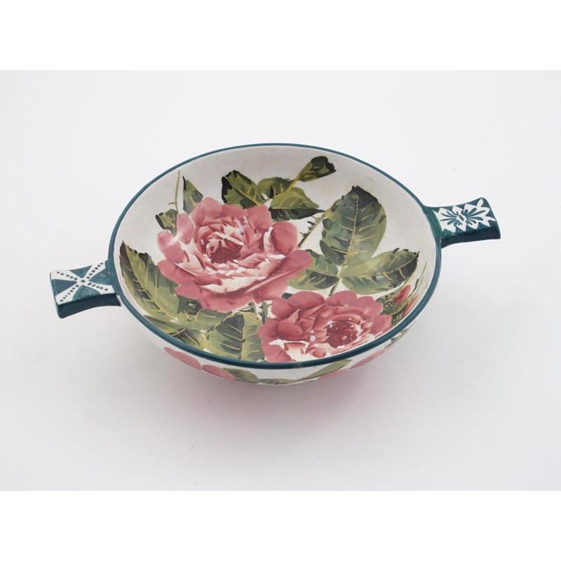 A Wemyss Pottery quaich, twin-handled form, painted with rose flowers in shades of pink and green on a white ground impressed and painted marks, T Goode painted mark 26.5cm. high