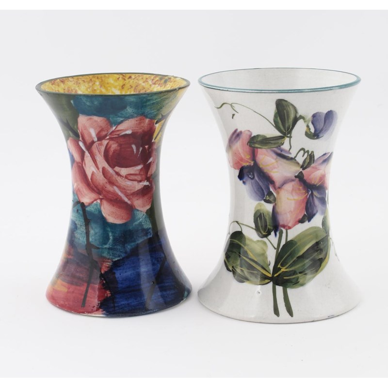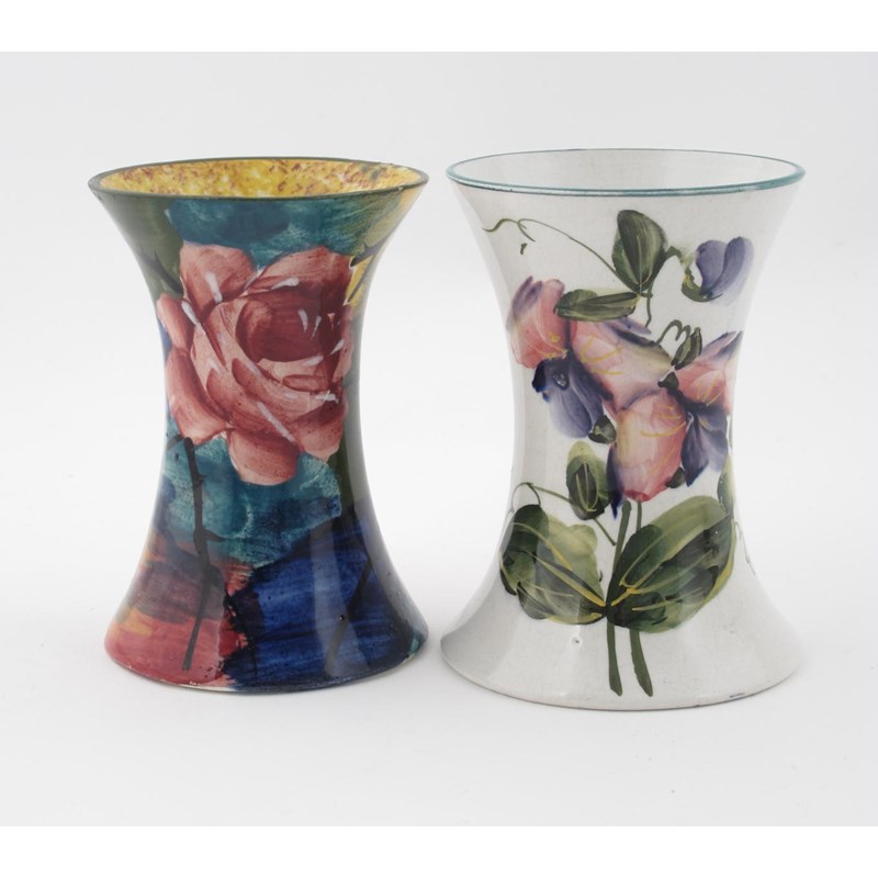 A 'Jazzy' Wemyss Pottery vase, waisted form, painted with the Cabbage Rose design on a mottled green, yellow and blue glaze, and a Wemyss 'Sweet-pea' vase painted marks, 11cm. high