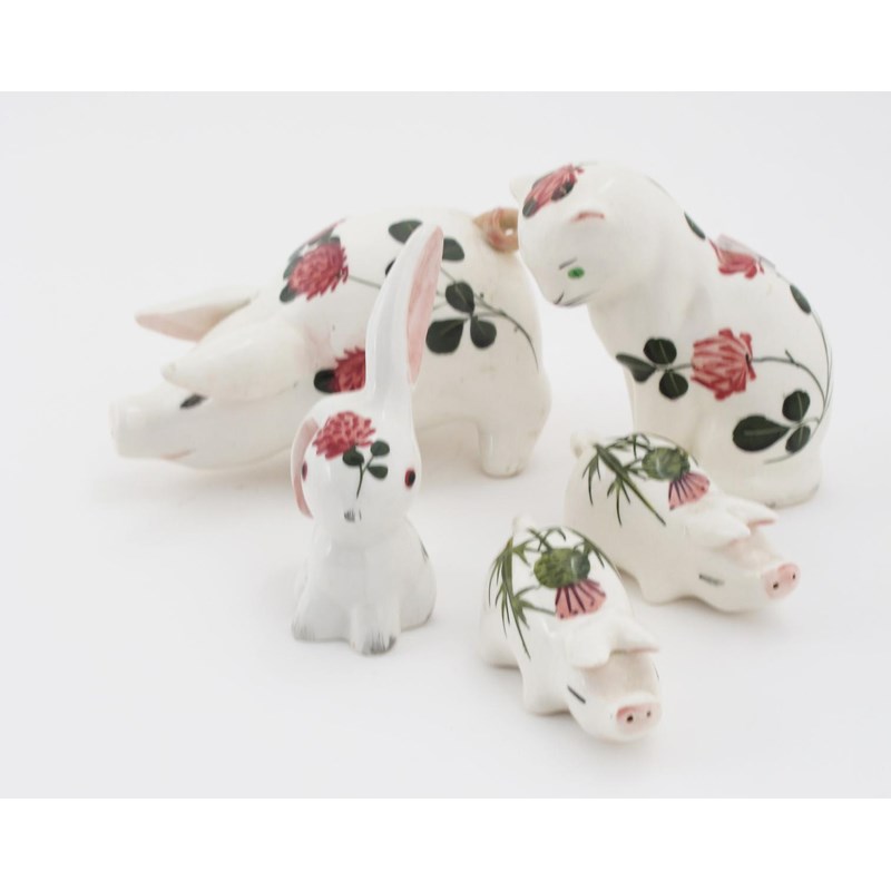 A Wemyss Ware heart-shaped tray, painted with stylised panels and foliage sprays, in brown, green and blue, and a collection of Wemyss style ware by various factories including a Bristol Pottery fluted tray, a Villeroy & Boch cherry pattern plate, two Wemyss cockerel plates by Brian Adams and five Plichta animals various marks, heart-shaped tray 31cm. wide