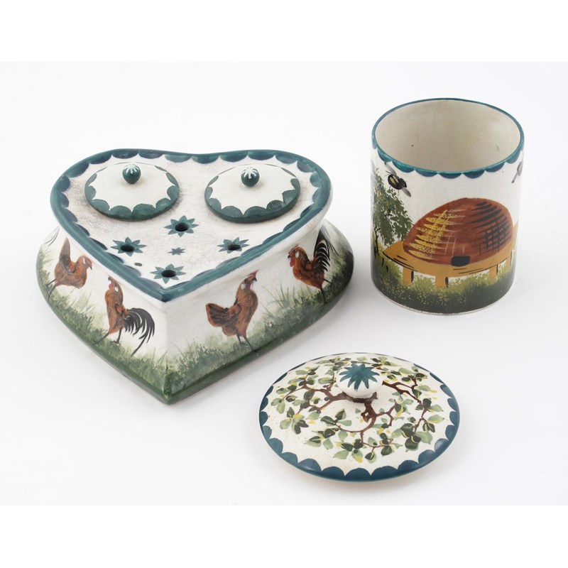 A Wemyss heart-shaped double inkwell, painted with a chickens and cockerel design in colours, a Wemyss Beehive pattern preserve pot, and a covered painted with foliage impressed mark, restored 16cm. wide