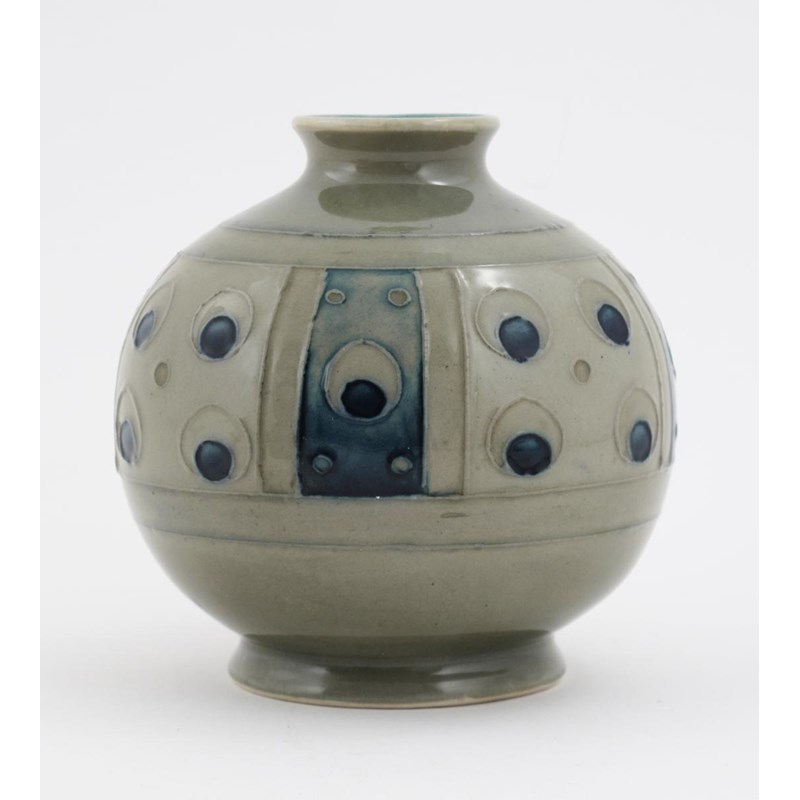 'Peacock Feathers' a Moorcroft Pottery vase designed by William Moorcroft, ovoid, tubeline decorated with an abstracted feather design in blue on a celadon ground impressed factory marks, painted blue marks, professionally restored, 10.5cm. high
