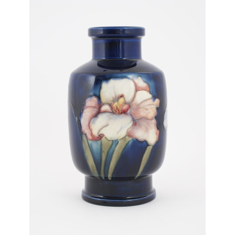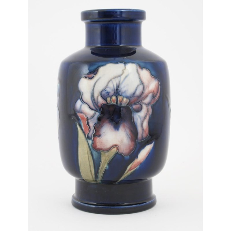 'Flag Iris' a Moorcroft Pottery lamp base designed by William Moorcroft, shouldered and footed cylindrical form, painted in colours on a blue ground, impressed marks, painted green signature 21.5cm. high