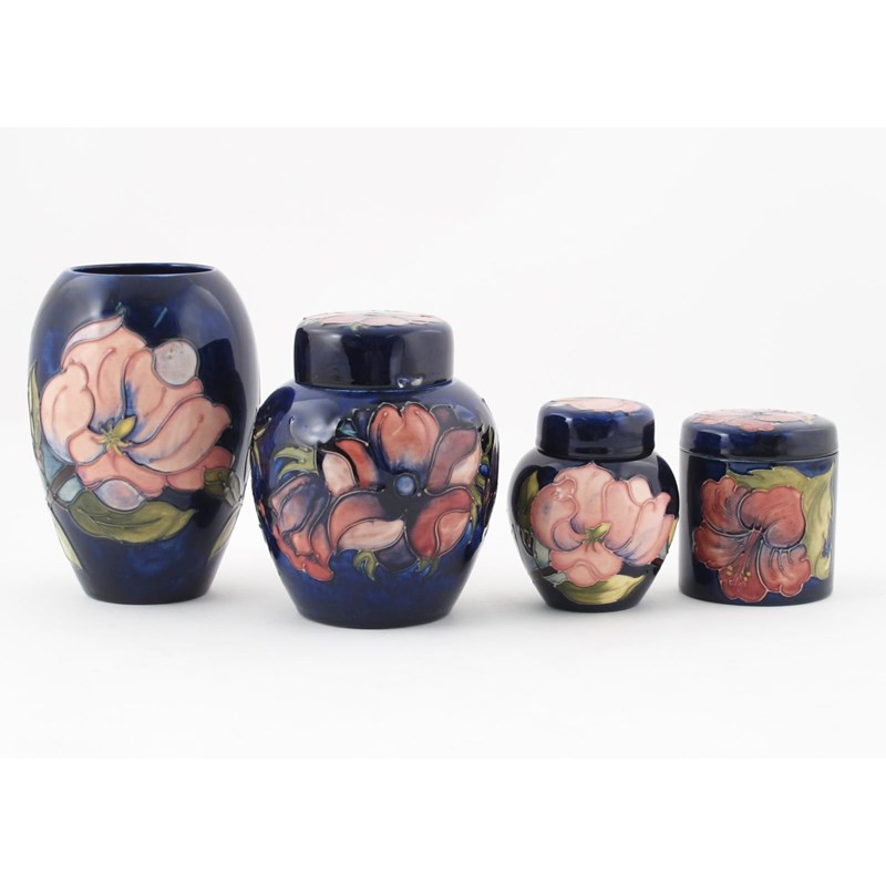 'Magnolia' a Moorcroft Pottery vase, painted in colours on a blue ground, a ginger jar and cover, an 'Anemone ginger jar and cover, and a Hibiscus jar and cover impressed and painted marks 17.5cm. high