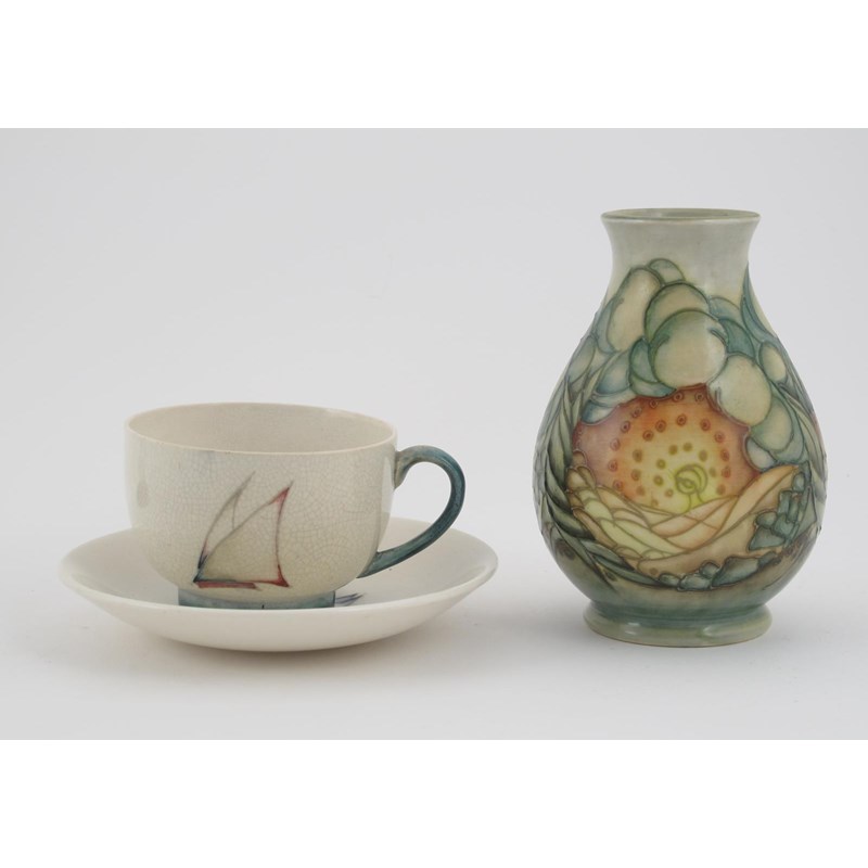 'Yacht' a Moorcroft Pottery cup and saucer designed by William Moorcroft, painted in blue and red on an ivory ground and a 'Summer Seasons' a Moorcroft Pottery vase designed by Sally Tuffin, impressed marks, Moorcroft Museum label, hairline to top rim of cup, saucer 14cm. diam.