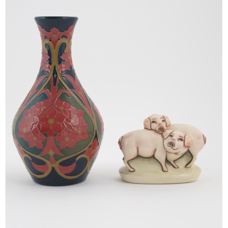 A Moorcroft Pottery Collector's Club limited edition solifleur vase, dated 2011, decorated with panels of pink flowers on a green and blue ground, and a Moorcroft Pottery model of two pigs impresed and painted marks, numbered 2/3 21cm. high