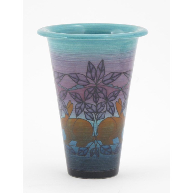 'Midnight Hare' a Dennis Chinaworks Trial vase designed by Sally Tuffin, dated 2005, painted in colours on a banded pale blue and purple ground impressed and painted marks, 13.5cm. high
