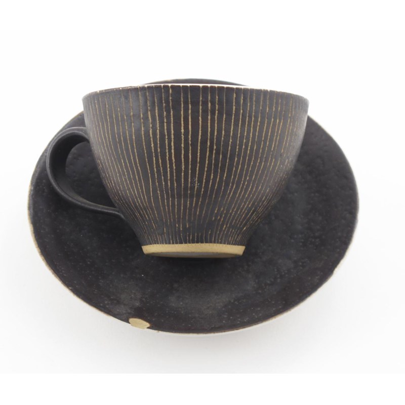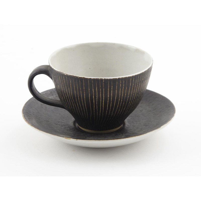 a sgraffito decorated coffee cup and saucer, covered in a bronze pitted glaze, the cup with vertical sgraffito lines, impressed seal marks, small chip to saucer 12.5cm. diam.