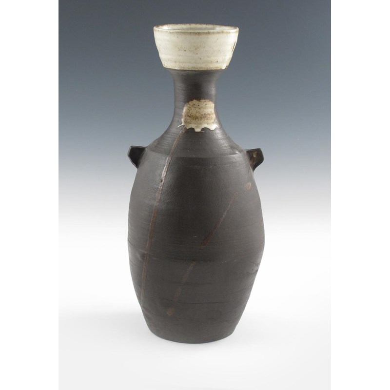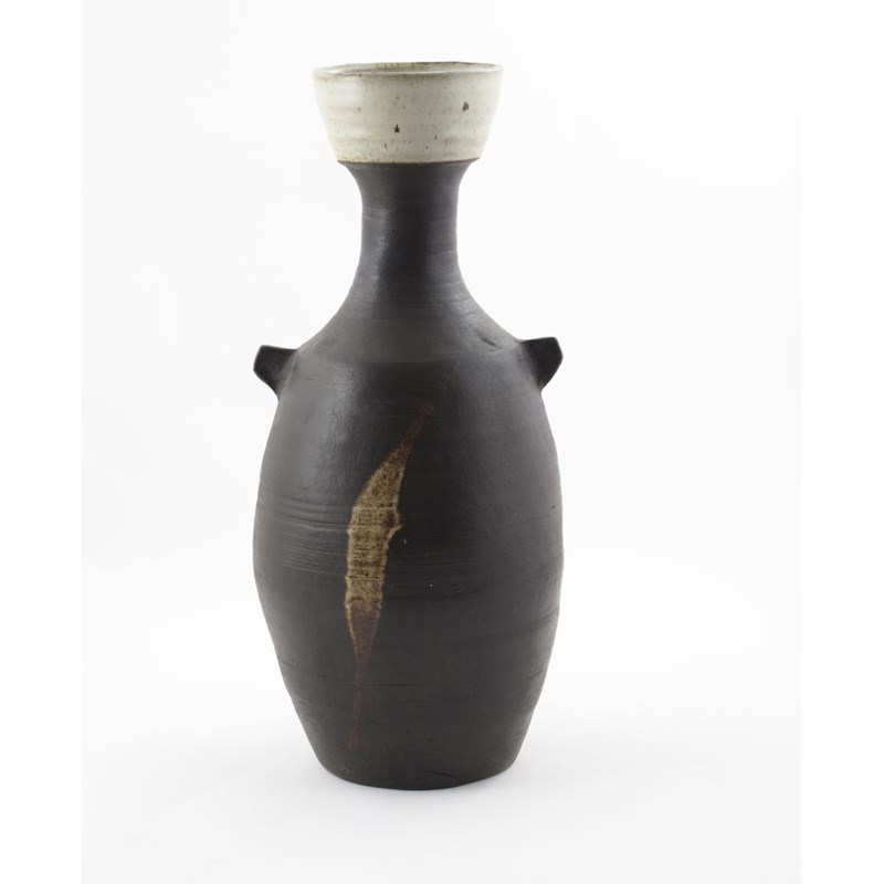 a large Leach Pottery stoneware vase, shouldered form with pinch handles, matt black with splashed speckled white brushstroke and neck, impressed seal marks, 51cm. high