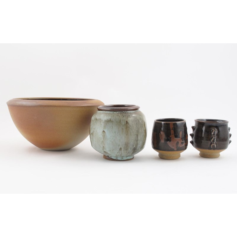 a Lowerdown Pottery vase, shoudlered octagonal form covered in a streaked green-white glaze, and three John Leach Muchelney Pottery pieces impressed seal marks, 12cm. high