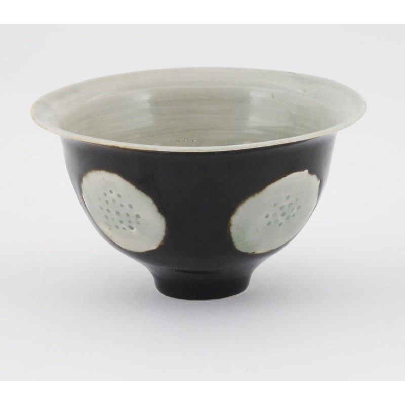 an unusual Lowerdown Pottery porcelain rice grain footed bowl, with flaring rim, the body pierced and glazed with celadon under tenmoku, impressed seal mark 19cm. high