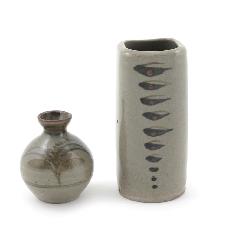 a stoneware vase, square section painted with an abstracted ear of corn design, and another Lowerdown Pottery vase impressed seal marks 12.5cm. high