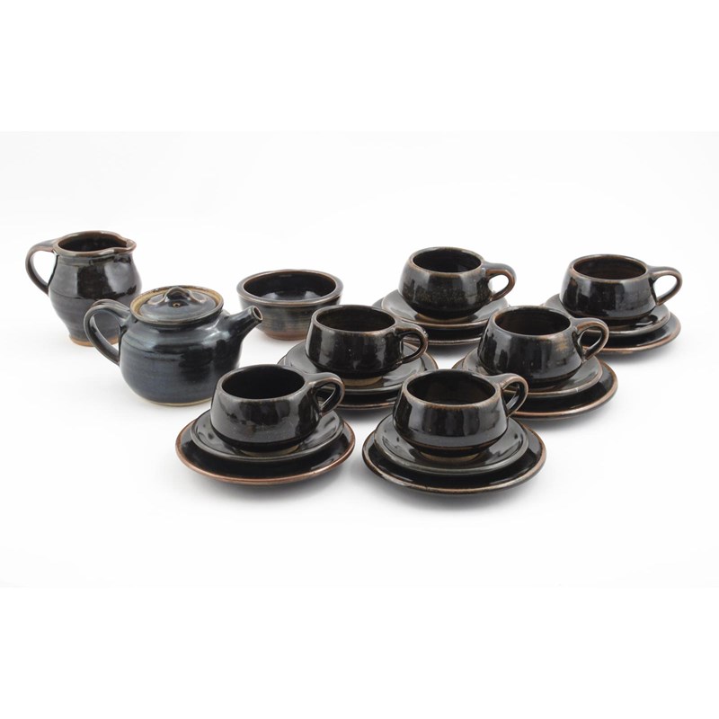 an Aylesford Pottery stoneware tea set designed by David Leach, covered in a tenmoku glaze, comprising; teapot and cover, milk-jug and sugar basin, six cups, saucers and side plates impressed marks, teapot 11cm. high