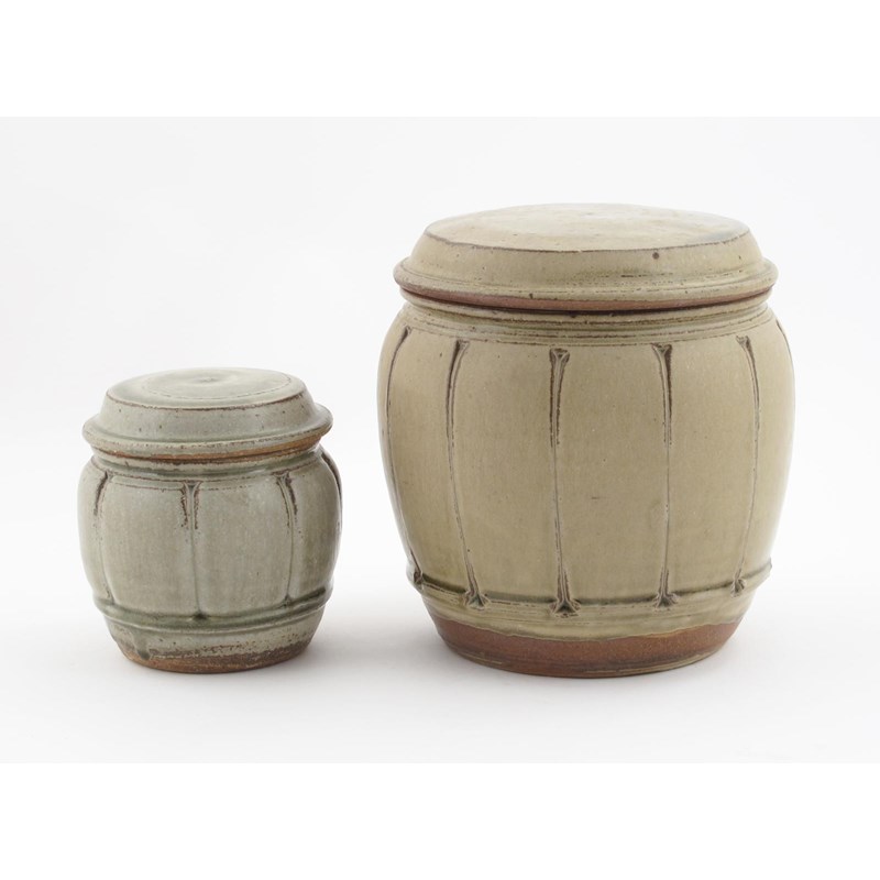 a stoneware storage jar and cover, with incised flute decoration, glazed to the foot in ash, and another Mike Dodd storage jar and cover smaller flooded seal mark 21.5cm. high