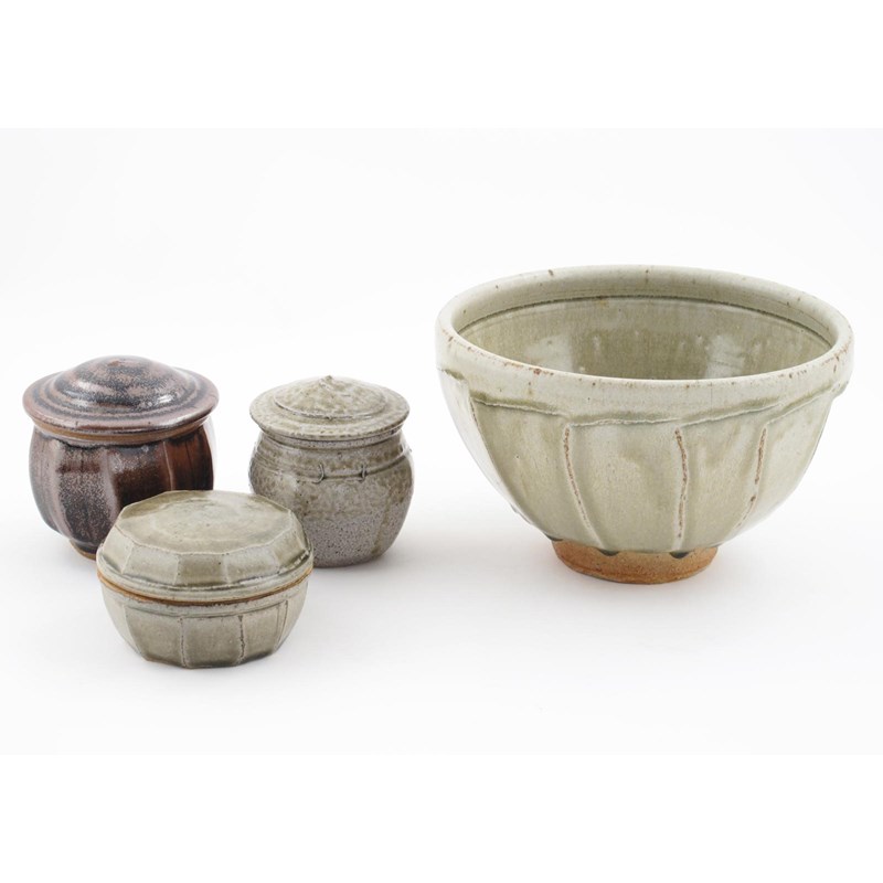 a stoneware cut-sided footed bowl, covered to the foot in an ash glaze, and three various storage jar and covers unsigned, crack to bowl 22.5cm. diam.