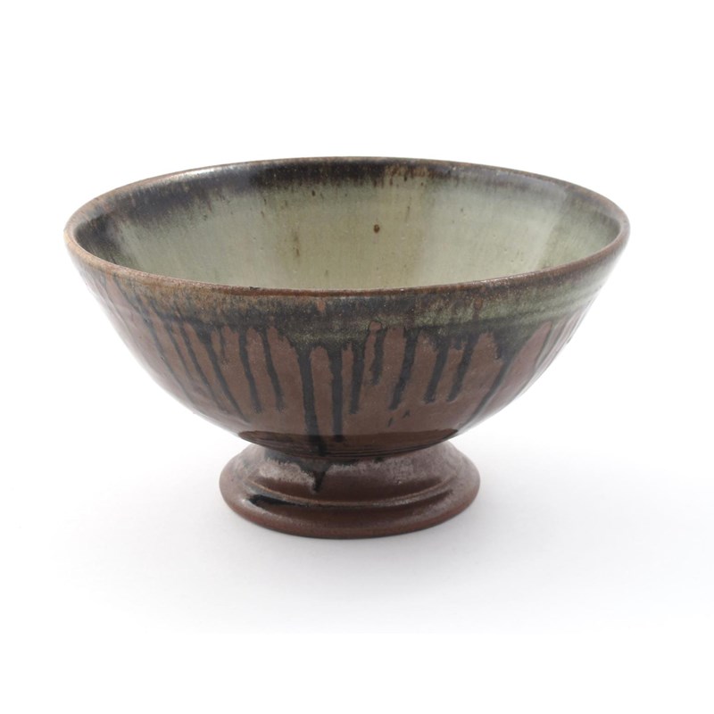an unusual pedestal bowl, the exterior covered in a running brown glaze, the interior ash green unsigned 28.5cm. diam.