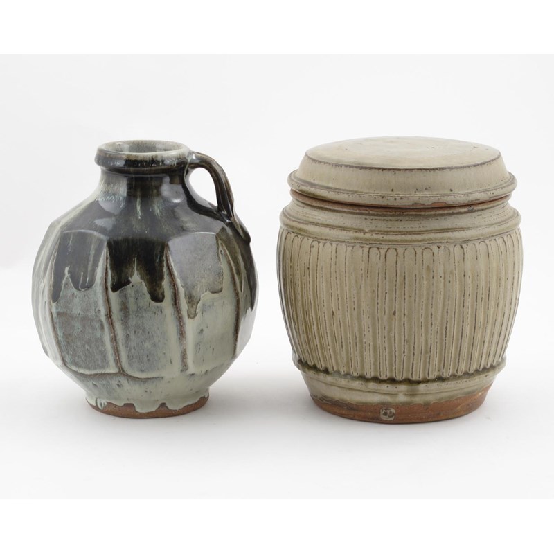 a stoneware storage jar and cover, decorated with a band of incised coulmn decoration, glazed ash, and a Mike Dodd single-handled vase impressed seal mark, 22cm. high